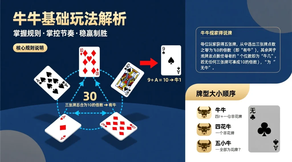 牛牛的核心規則簡單卻富含邏輯性。每位玩家會獲得五張牌,目標是從中挑出三張加總為10的倍數(即「有牛」),剩餘兩張牌點數總和的個位數即為「牛幾」。若五張牌中任意三張都無法湊成10的倍數,即稱為「無牛」。