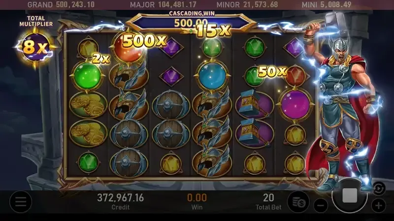 在玩法設計上,雷神之錘並非傳統拉霸機的固定連線模式,而是採用「消除掉落」與「隨處支付」的現代老虎機機制。只要版面中出現足夠數量的相同符號,即可形成得分,讓新手也能快速理解遊戲邏輯。